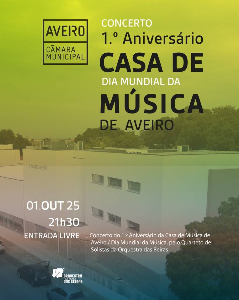 A música celebra-se a si própria, celebra a cultura, celebra os públicos que são a sua razão de ser e a tornam viva e, neste caso particular, os espaços que a acolhem. No Dia Mundial da Música, a Orquestra das Beiras associa-se às comemorações do primeiro aniversário da Casa de Música de Aveiro, em Aradas, numa iniciativa da Câmara Municipal de Aveiro, num ambiente festivo e intimista. Um quarteto de solistas da Orquestra apresenta um programa especialmente pensado para assinalar esta dupla efeméride, evocando a diversidade das linguagens musicais, a alegria do encontro e o poder universal da música a favor da coesão humana. Um concerto que celebra a memória e abre portas ao futuro.
