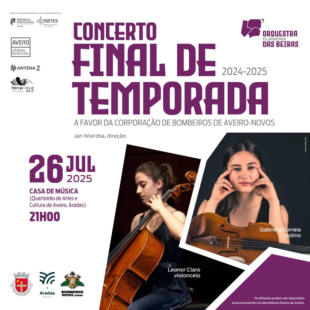 A Orquestra das Beiras termina a sua temporada 2024-2025 na Casa de Música – Quarteirão de Artes e Cultura de Aveiro (Aradas) oferecendo um concerto solidário a favor dos Bombeiros Novos de Aveiro, que conta com o apoio da Direção-Geral das Artes, da Câmara Municipal de Aveiro, da Junta de Freguesia de Aradas, da União das Freguesias de Glória e Vera Cruz, da Antena 2 e da Rádio Terra Nova.
