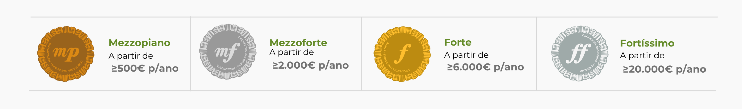 As categorias do programa de Mecenas da Orquestra são inspiradas na dinâmica expressiva da linguagem musical, desde Mezzopiano a Fortíssimo, refletindo diferentes níveis de envolvimento e compromisso. Nas categorias mais elevadas é possível uma articulação entre a empresa/empresário e a Orquestra para oferecer um espetáculo a favor de uma IPSS, gerando um círculo virtuoso entre empresas, cultura e solidariedade.